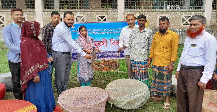 বকশীগঞ্জে প্রাণি সম্পদ উন্নয়ন প্রকল্পের সুফলভোগীদের মাঝে মুরগী বিতরণ