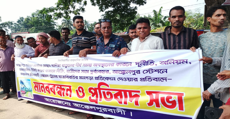 আক্কেলপুর স্টেশন মাস্টারের বিরুদ্ধে মানববন্ধন