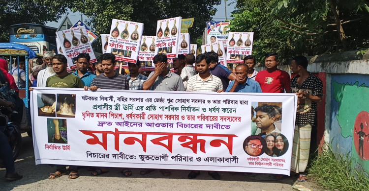 মাদারীপুরে গৃহবধূকে ধর্ষণ ও নির্যাতনের অভিযোগ, দোষীদের দৃষ্টান্তমূলক শাস্তির দাবিতে স্থানীয়দের মানববন্ধন