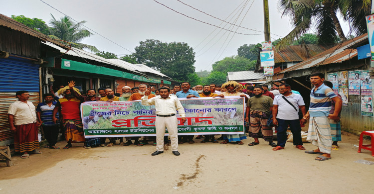 সাটুরিয়ায় ব্রিজের মুখে মাটি ভরাটের প্রতিবাদে কৃষকদের বিক্ষোভ ও মানববন্ধন।